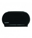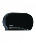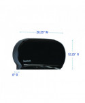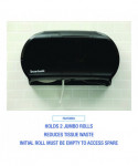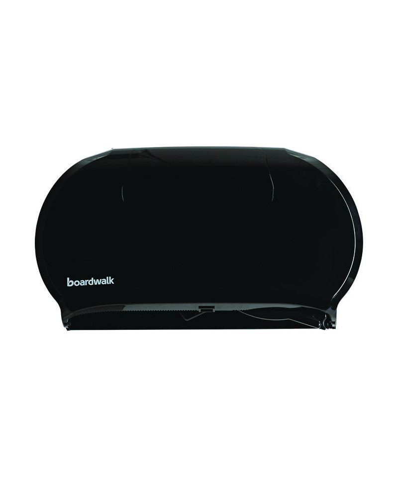 Sturdy Boardwalk® toilet tissue dispenser houses two universal jumbo rolls. The twin roll design allows auto transfer from one roll to the next. Having double coverage from multiple rolls eliminates runouts, providing access to replacement roll after initial roll depletes. Prevents waste by ensuring one roll is used up before transferring to the second. Multi-roll design saves labor since two rolls can be stocked at a time. Compatible with Boardwalk®, Windsoft®, and other brands of jumbo roll toilet paper.