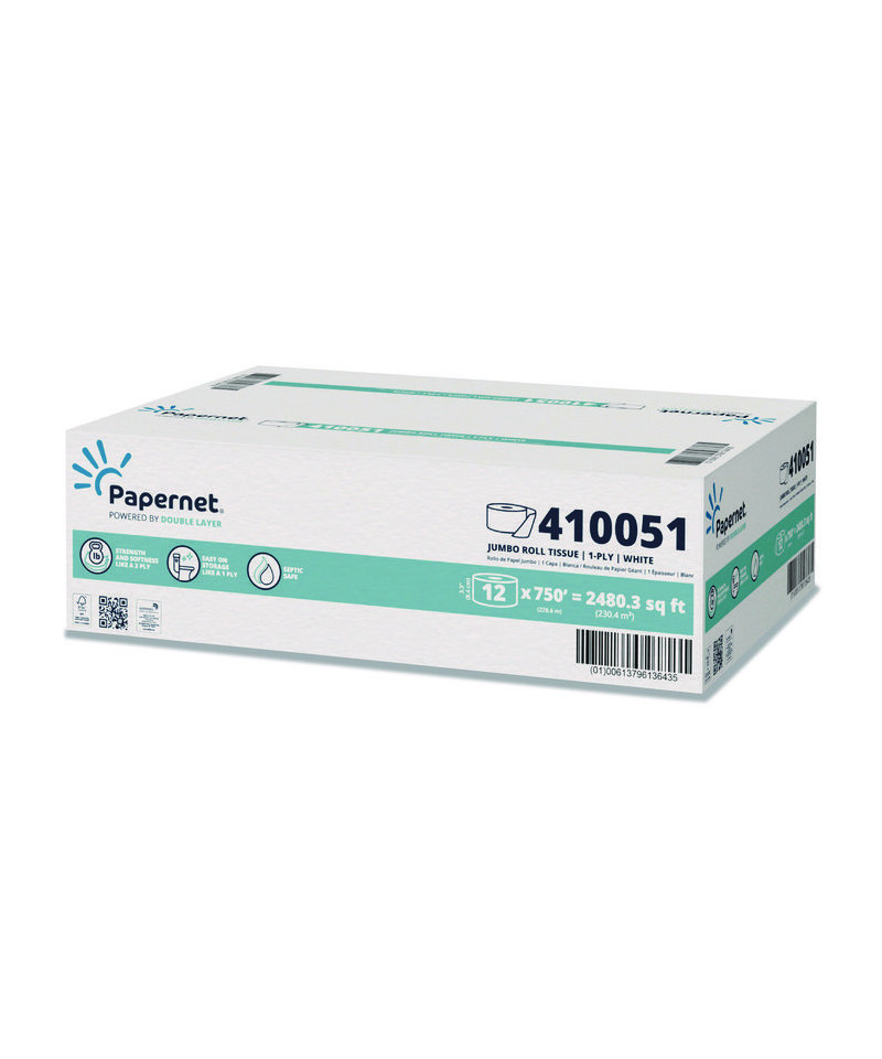 Double layer jumbo roll bathroom tissue offers the softness of a two-ply product with the affordability of a one-ply product and a long-lasting roll. This space-saving and cost-saving option is ideal for high-traffic commercial restrooms. Say goodbye to frequent roll changes with septic-safe Jumbo Rolls from Papernet. This economical solution offers feet after feet of toilet tissue to reduce restroom maintenance costs.