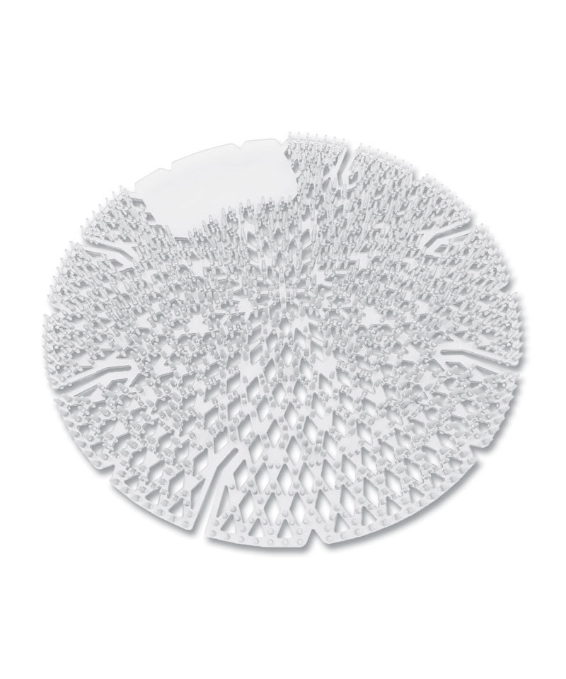 Made from a specially engineered copolymer that is impregnated with a powerful organic odor-counteracting compound. It incorporates a two-sided anti-splash texture, preventing splash back and cross-contamination of urine to other areas outside the restroom. Flexible for a proper fit to any urinal contour. The translucent design offers a clear view of the drain to ensure it remains free-flowing as it collects debris before the drain is clogged. Safe for use in waterless urinals as well.