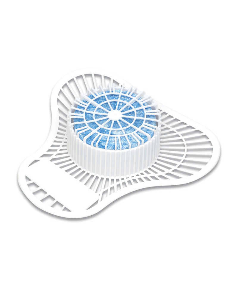 Flexible screen traps debris, protecting the urinal from unnecessary damage. Attached enzyme block cleans and deodorizes as you flush. Screen and block combo fights uric acid odors. Lasts up to 30 days.