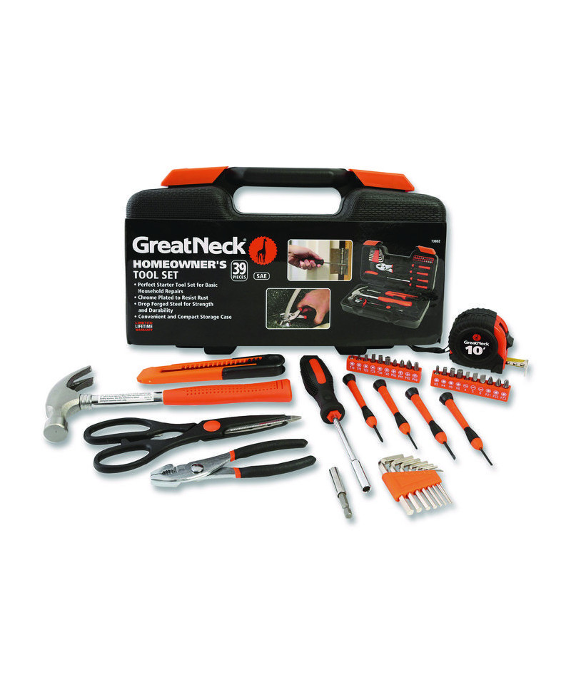 Keep the most important tools handy wherever life might take you. Great Neck® Tool Sets are perfect for just about any general-purpose maintenance or repair project. With all the tools you might need in a convenient, compact storage case, it's easy to keep these sets in a closet, office cabinet, dorm room, garage or shed, ready to take on the next task. All included tools have been precisely manufactured with high-strength materials, and all metal components are made of drop-forged, chrome-plated steel to ensure long-lasting, rust-resistant performance. Included storage case also feature a snap-in design to ensure each tool remains organized, in its assigned place, ready for easy retrieval.