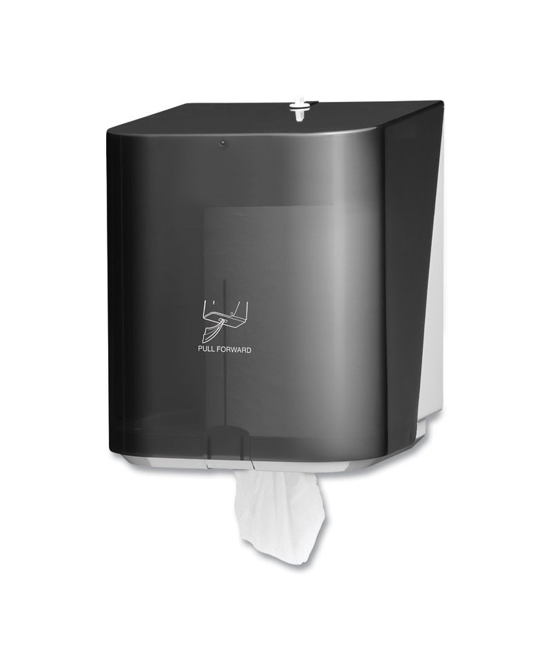 Kimberly-Clark Professional's In-Sight Sr. Center Pull paper towel dispenser is a great choice when efficiency and hygiene top your list of priorities. It is compatible with high-capacity center-pull paper towels by respected Kleenex® and Scott® Brands, and it offers no-touch dispensing, which helps reduce the spread of germs and dirt. The durable plastic material has a smoked transparent cover, and there are no moving parts, greatly reducing the possibility of mechanical failure. The towel dispenser features optional key-locking (to reduce pilferage) and an easy-loading design.