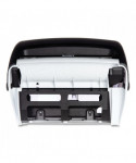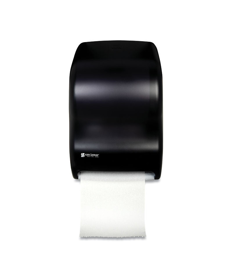 Hygienic touchless dispensing prevents germ spread. Just tear off towel and sensor activates to present another! Portion control provides 10" length every time. Dispenses any paper quality. Holds rolls up to 8" wide x 8" dia. and one 4" stub roll. Automatic transfer device allows complete usage of stub roll to eliminate waste. Lock prevents pilferage (waffle key incl.). Operates on four D alkaline batteries (sold separately); battery usage equivalent to dispensing 100, 800-ft. rolls. Impact-resistant plastic.