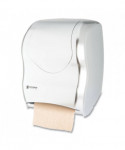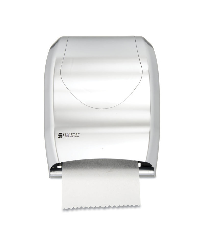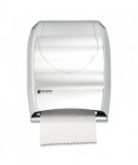 Hygienic touchless dispensing prevents germ spread. Just tear off towel and sensor activates to present another! Portion control provides 10" length every time. Dispenses any paper quality. Holds rolls up to 8" wide x 8" dia. and one 4" stub roll. Automatic transfer device allows complete usage of stub roll to eliminate waste. Lock prevents pilferage (waffle key incl.). Operates on four D alkaline batteries (sold separately); battery usage equivalent to dispensing 100, 800-ft. rolls. Impact-resistant plastic.