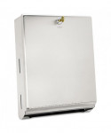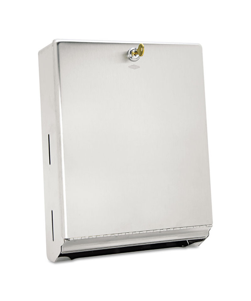 Dispenses 400 C-Fold or 525 Multifold towels measuring 3 1/8" to 3 13/16" without adjustment or adapters. Cabinet slots indicate refill time. Satin finish. Door has tumbler lock and piano hinge.