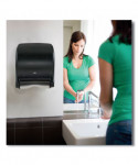 The Tork® Hand Towel Dispenser is an attractive dispenser that presents a clean, modern appearance that complements all décor. Translucent cover allows for "at a glance" inspection for refills. High impact plastic hides scratches and maintains image. The smooth cover with no recesses is easy to clean and maintain. High capacity for reduced costs and fewer service interruptions. Locking mechanism with key entry provides built-in pilferage control. High impact plastic and design help prevent breakage. Replaceable covers and lock fingers. No exposed metal parts to corrode or rust. Built to last.