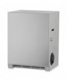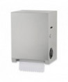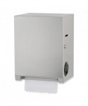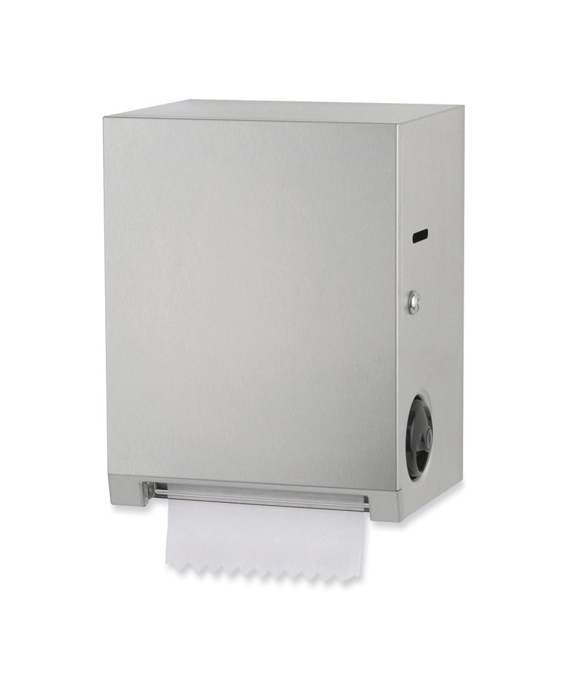 Satin finish stainless steel. Touch-free pull-towel mechanism dispenses 12" length per pull of universal towels. Accommodates 8" wide, up to 8" diameter rolls, 800 ft long, plus 3.5" diameter stub roll with automatic transfer. Door has tumbler lock and piano-hinge.