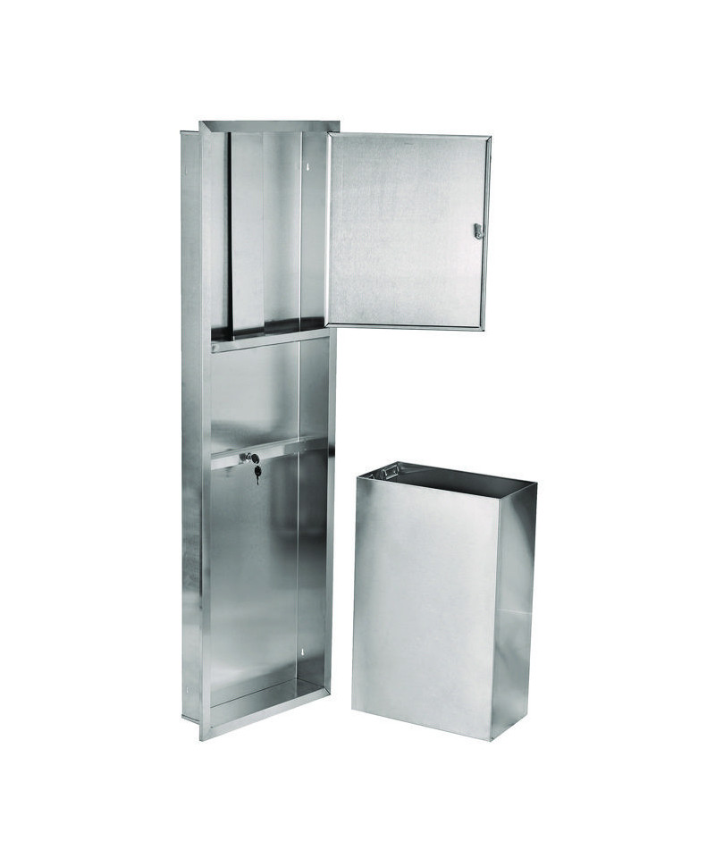 Our Recessed Paper Towel Dispenser and Waste Receptacle is made from long-lasting, heavy gauge stainless steel with a smooth satin finish. With our self-feeding, rounded hemmed opening, paper towels dispense without tearing, limiting waste. The paper towel tray can hold 600 C-Fold or 800 Multifold paper towels. Our waste receptacle features an ample sized leakproof 12-gallon waste container that is ideal for high traffic areas such as public bathrooms. Inside the wastebasket is two stainless steel clips to ensure the trash bag is secure throughout the day. Each door is furnished with a tumbler lock key to prevent any unauthorized access.