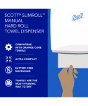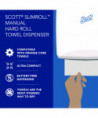 Scott provides enhanced hygiene solutions for critical environments. With the Scott Slimroll Towel Dispensing System you have the benefit of a compact dispenser designed to fit in tight spaces with a slim profile. Available in various colors, Scott Slimroll Towel Dispensers come in automatic and manual configurations. With the Slimroll Paper Towel Dispenser, the ultra-compact size lets you wall mount it close to sinks in tight places such as a nurses' station or tiny classroom sink and keeping it close to the water helps reduce drips and slips. The sleek design and touchless dispensing system helps to minimize the spread of dirt and germs all while providing 25% more hand dries over folded towels. The most efficient system on the market, the ultra-compact Scott Slimroll Dispenser Towel is compatible with Scott Orange Core Slimroll towels. The dispenser is made of high-impact plastic, with translucent sides and opaque cover. The Slimroll Dispensing System is part of the Scott* Solutions from one of the world's most trusted brands. This dispenser is backed by a lifetime warranty and is designed to save you time and money while reducing service disruptions and user complaints.