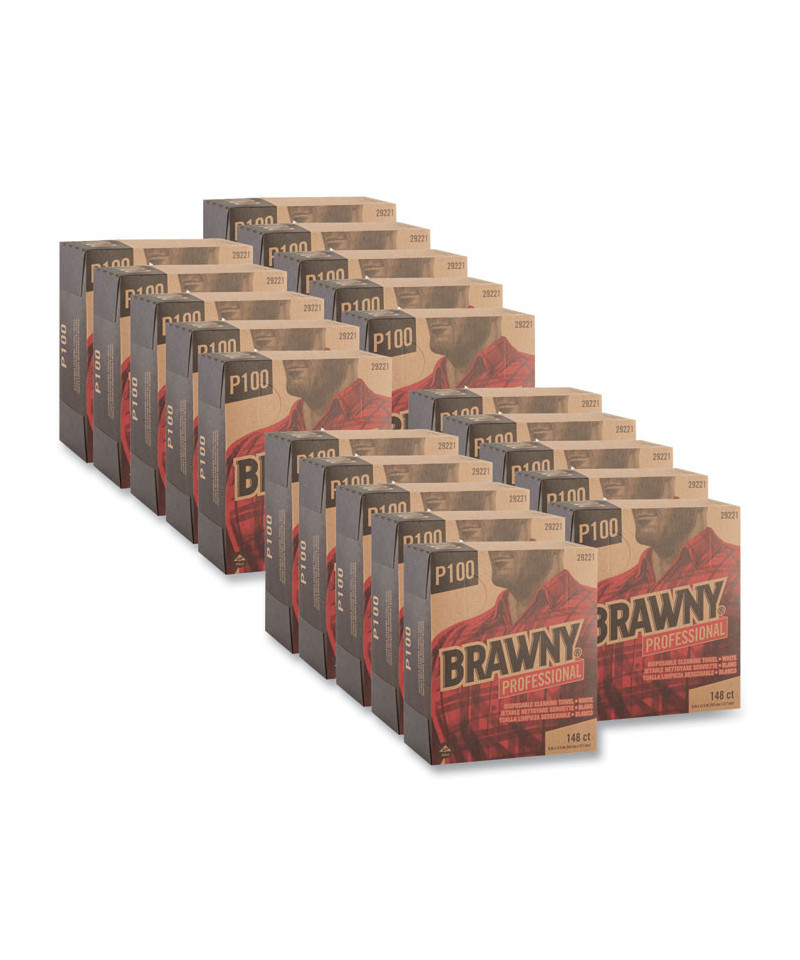 Brawny® Professional P100 disposable cleaning towels offer superior quality and absorbency for quick clean-up of light oils and solvents. Made of 2-ply paper, these cost-effective light-duty industrial wipes are stronger and more absorbent than ordinary paper towels, providing streak-free cleaning that's ideal for spray-and-wipe applications. They also make great industrial hand wipes. Towels come in a convenient, portable pop-up dispenser box that helps protect unused wipers from contamination. It offers quick and easy hands-free, one-at-a-time dispensing for waste and cost control.