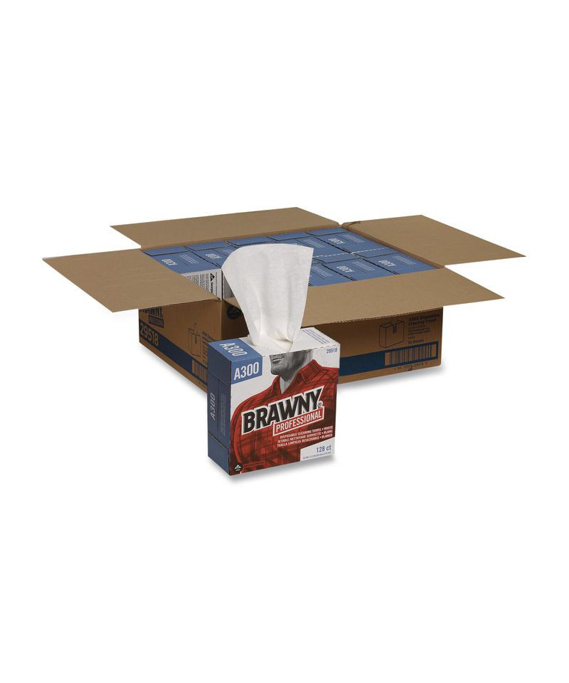 The Brawny® Professional medium weight general purpose wiper is made from a lighter airlaid bonded cellulose to deliver exceptional capacity for tackling spills and cleaning up oil-based and grease products. This cost-effective wiper makes cleaning a breeze. Popular uses include patient care (washcloths), retail food stores, healthcare and light manufacturing cleaning tasks. These wipers come in a convenient, portable dispenser box for added protection and quick and easy hands-free dispensing. Great for cleaning oil, grease and grime. Picks up spills on smooth surfaces. Soft enough for personal use, yet strong enough to stand up to light solvents.
