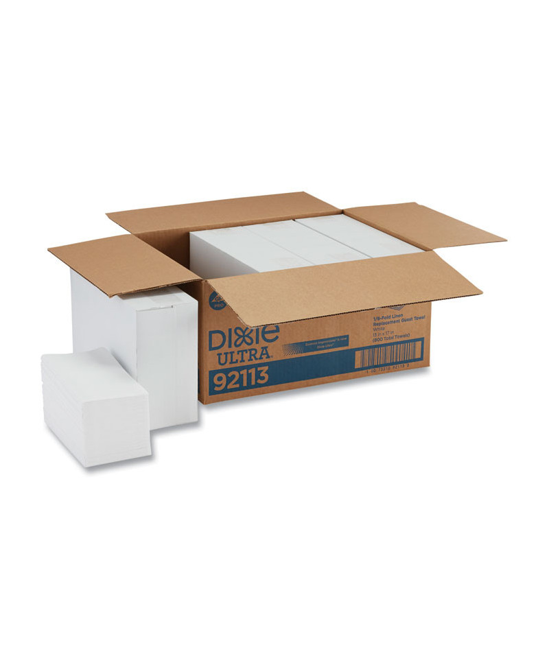 Dixie Ultra® premium soft and durable white guest towels are made from our fine linen paper that is certain to please your most discriminating guests. This ultimate linen replacement is cost-effective and versatile, making it ideal for use in such places as hotel rooms and country club locker rooms for everything from wiping shoes to removing make-up. And finer establishments recognize this towel as an excellent choice for washroom hand-drying. Pamper your customers with one of the finest disposable guest towels available while you enjoy hassle-free, disposable convenience.