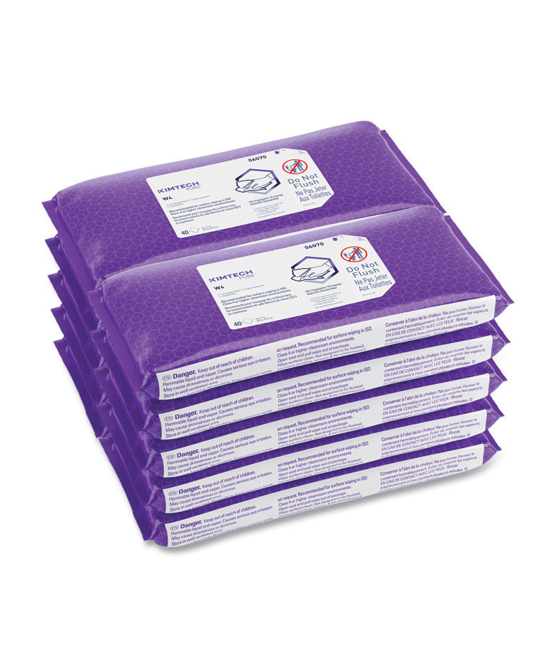 KIMTECH PURE W4 PreSat Alcohol WIpers are designed for ISO Class 4 or higher cleanroom environments. A 70% isopropyl alcohol and 30% deionized water solution saturates sturdy 100% polypropylene, so you'll enjoy an easy one-step application on critical surfaces. They come in a resealable pouch, with a case liner, for convenience and sanitary protection.