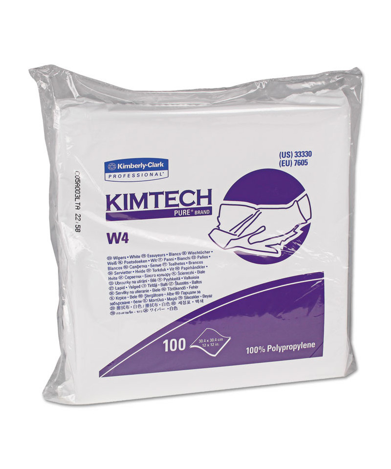 Kimtech™ Pure W4 Critical Task Dry Wipers have a 100% polypropylene construction and are thermally bonded with no glues or binders. They are acid-, base- and solvent-resistant and feature straight, clean knife-cut edges to minimize lint. The wipers are double bagged with a case liner and are specifically designed for ISO Class 4 and higher cleanrooms. These wipers are ideal for use in the pharmaceutical, high tech, biotechnology and medical device industries. Additionally, the polypropylene used in the manufacture of Kimtech™ Pure W4 Dry Wipers meets the requirements set forth by the FDA for Olefin polymers (21 CFR 177.1520) used for food packaging/contact. (Please note, the FDA does not regulate wipers as food packaging).