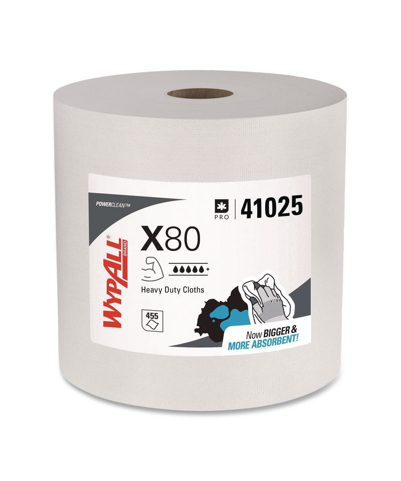 WypAll® is the number one brand of disposable wipes in the US and Canada. Maximize performance while minimizing time, effort and product waste. If you've been using industrial cloth towels, it's time to make the switch to WypAll® PowerClean™ X80 Cloths. These cloths feature innovations like high-tech Hydroknit® fast-absorbing material and are durable for scrubbing. WypAll® X80 cloths now absorb over 20% more oil and up to 15% more water than before. In addition, they now feature a tough, precision-engineered surface texture, making them even more effective for your cleaning tasks. The heavy-duty cloths are made of soft pulp fibers, bonded to a polypropylene base sheet for absorbency and durability, making them suitable for removing dirt, oil, grime and solvents in industrial and manufacturing businesses. The cloths are reusable and reinforced for strength when wet and dry. These bulk cloths are a great alternative – safer and more efficient – to replace laundered rental shop towels and cleaning towels. These premium industrial cleaning cloths can be used for heavy-duty machine and part wiping, wiping metal shavings, prepping surfaces with solvents, and cleaning rough surfaces. When you're running a business, it pays to use the very best supplies. For the toughest grease and grime, trust the performance and innovation of WypAll® PowerClean™ X80 Heavy Duty Cloths.