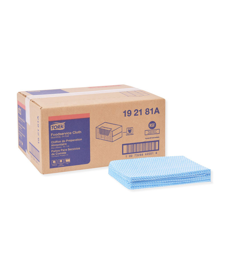 The Tork Foodservice Cleaning Towel is an excellent towel for use with quat sanitizers when the primary task is to deliver sanitizer to hard surfaces. Color-coded—designating area of use by color is a foodservice best practice that eliminates the potential for cross-contamination. Easy to rinse, dries quickly and is low linting. Good absorption will allow cloth to pick up dirt and mop up spills effectively. The product comes in a sturdy, easy to store self-dispensing corrugated box. Antimicrobial cloths inhibit growth of odor-causing microorganisms on the product surface.