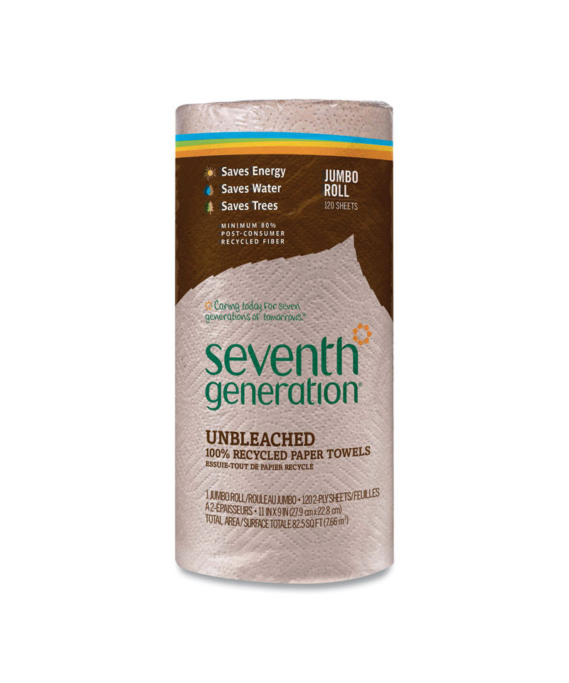 Because fewer natural resources are consumed during manufacturing, natural unbleached recycled paper towels are Seventh Generation's most sustainable yet. Processed without chlorine with no added dyes or fragrance. Full 11" x 9" sheet size. Two ply for absorbency and strength.