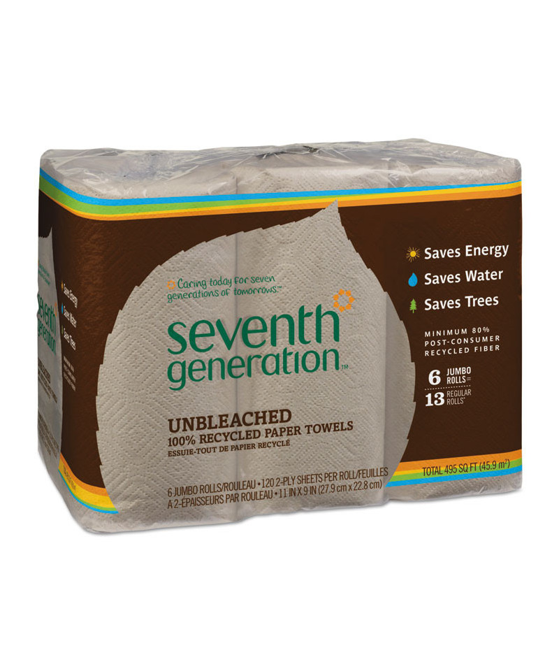 Because fewer natural resources are consumed during manufacturing, natural unbleached recycled paper towels are Seventh Generation's most sustainable yet. Processed without chlorine with no added dyes or fragrance. Full 11" x 9" sheet size. Two ply for absorbency and strength.