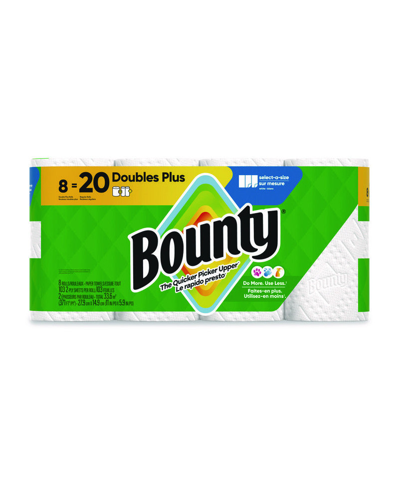 Spilled your drink? Quick! The Quicker Picker Upper. Be ready to tackle messes with Bounty Paper Towels! Each sheet is 2x more absorbent and picks up spills and messes quicker vs. the leading ordinary brand so you can use less. Bounty Select-A-Size towels are versatile, so you can choose your sheet size depending on your mess. Bounty products are proudly made with a commitment to creating solutions for a sustainable future. That's why for every tree used, at least two are regrown so you can conveniently and confidently clean messes in the kitchen and around the house. Bounty always has your back in and out of the kitchen so whether it's juice on the counter or ice cream on the table, we make sure spills won't stand a chance.