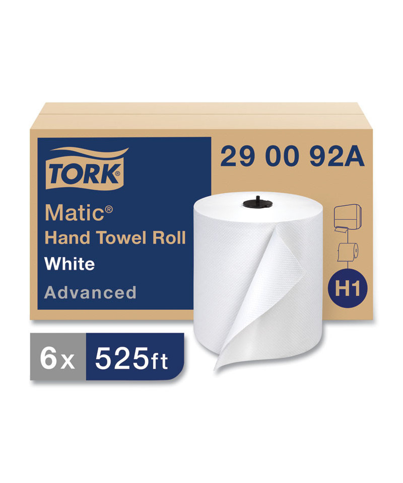 The Tork® Advanced Matic® Hand Towel Roll is a soft, strong, and highly absorbent paper roll towel that offers the perfect combination of quality, performance, and value. Designed specifically for the Tork Elevation® Matic® Hand Towel Roll Dispensers, this Tork Advanced Matic Hand Towel offers a truly best-in-class product for no-touch, hygienic dispensing systems. Ideal for Class-A office buildings and upscale dining facilities. This towel saves time and controls consumption by one-at-a-time sheet dispensing. Long-lasting rolls minimize restroom maintenance costs while maximizing service. Available in an Easy Handling® Carry Box.