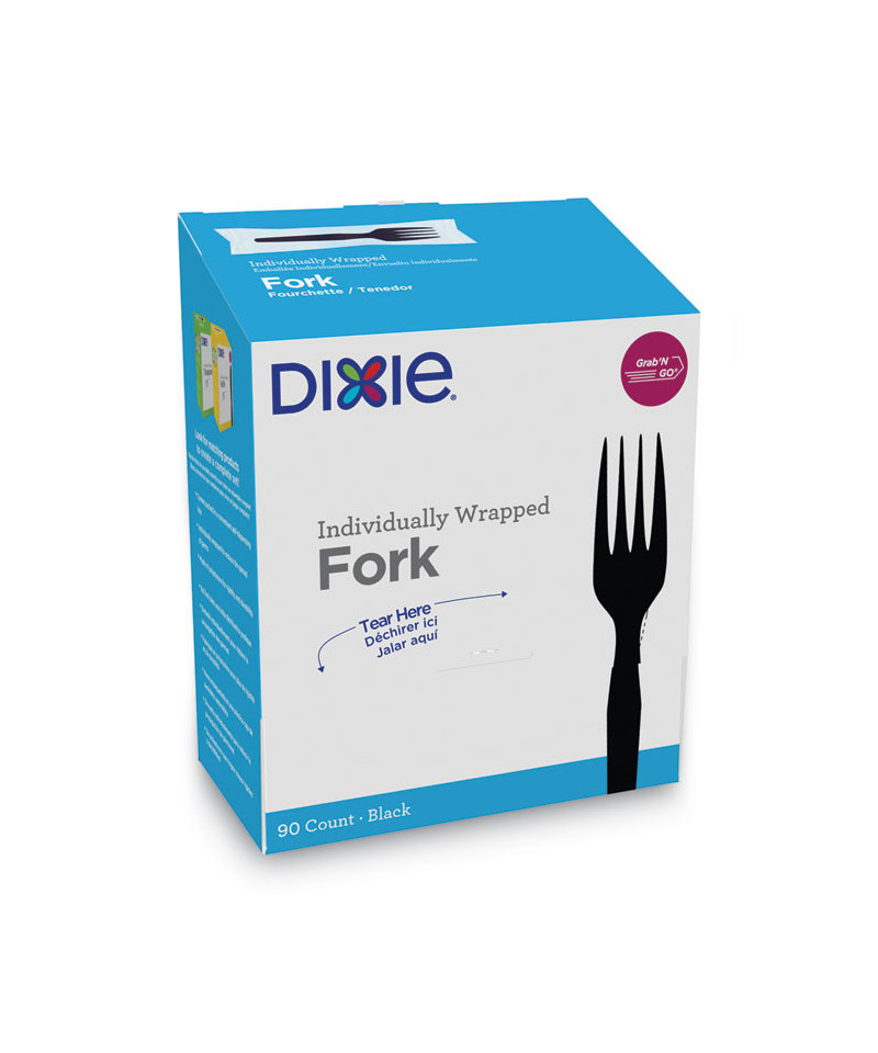 The Dixie® Medium-Weight Polystyrene Disposable Plastic Cutlery Grab-n-Go® lets you get rid of those messy, germ-collecting and wasteful open cutlery containers and replace them with individually wrapped forks in organized self-dispensing boxes. Dixie® Grab-n-Go® cutlery makes being well stocked super easy. The portable, disposable, easy-store boxes convert directly into quick-grab displays. Just open the box and put it on the counter (really). Grab-n-Go® cutlery puts a stay-well spin on break time. Each piece of the Dixie® plastic cutlery is protected by its own plastic covering, so the only person who touches it is the person who uses it. That's called good hygiene. These medium-weight individually wrapped plastic cutlery are great for most foods; perfect for office breakrooms, restaurants and more.