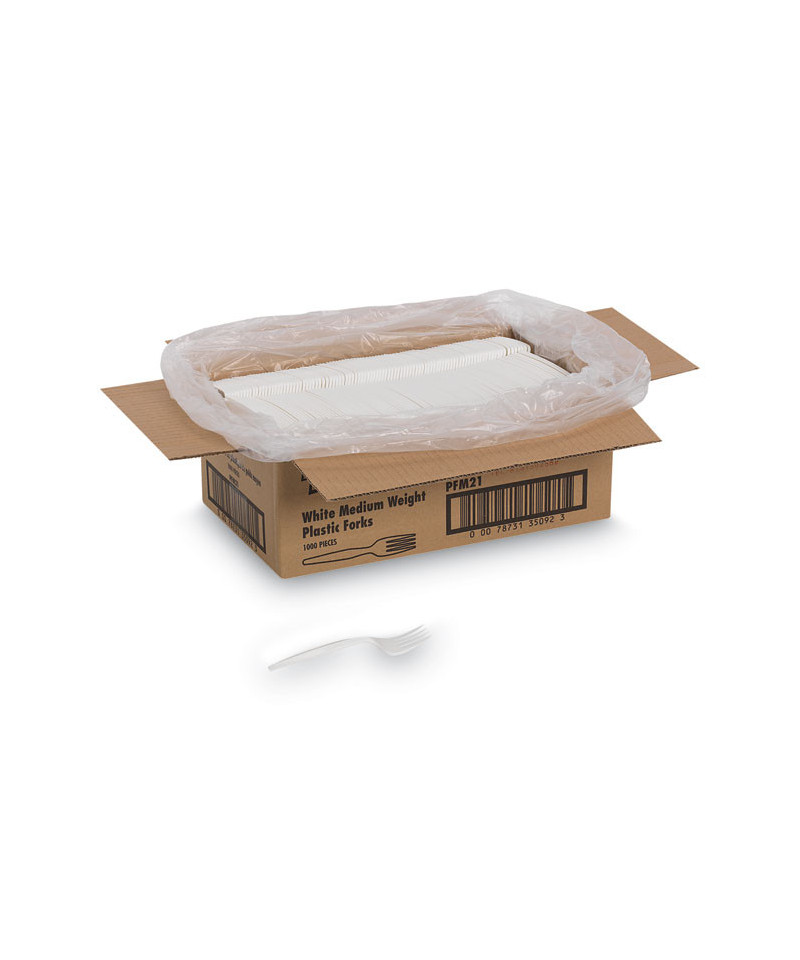 Plastic Cutlery, Mediumweight Fork, Plastic, White, 1,000/Carton