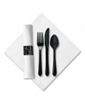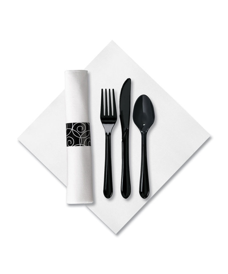 Make an excellent impression with elegantly modern heavyweight utensil sets. Each combo is prewrapped in a thick, dinner-sized Linen-Like® paper napkin. Matching napkin ring keeps everything together.