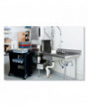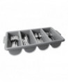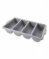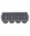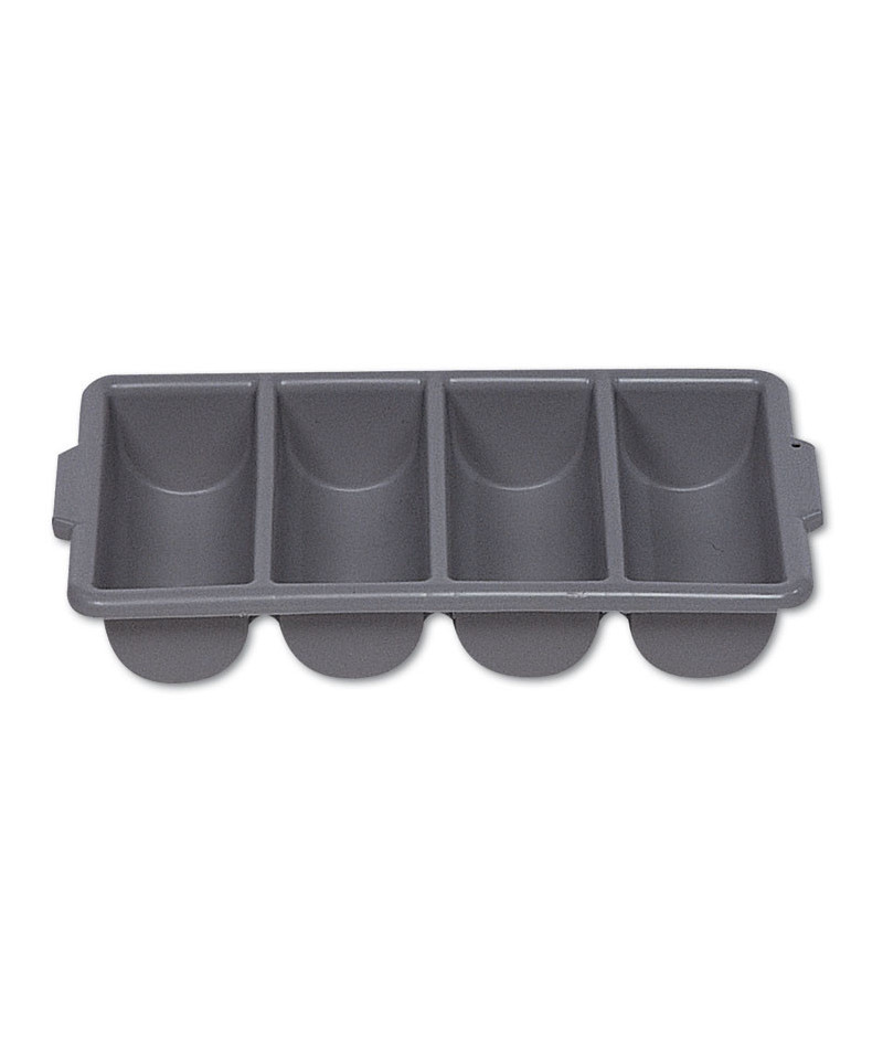 Four-compartment bin is ideal for storage or dispensing cutlery and condiment packets. Ribbed design and special resin material provide strength. Has comfortable handles. Dishwasher safe; NSF certified.