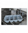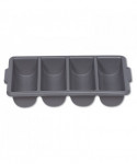 Four-compartment bin is ideal for storage or dispensing cutlery and condiment packets. Ribbed design and special resin material provide strength. Has comfortable handles.