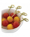 Add elegance to any catered event with a tastefully knotted bamboo pick. Attractive sculpted knot allows for an easy grip when patrons reach for an appetizer. Bamboo is a sturdy alternative to plastic and wood options. Knotted bamboo picks are ideal for sophisticated hors d'oeuvre or cocktail service and for dressing up sandwich servings.