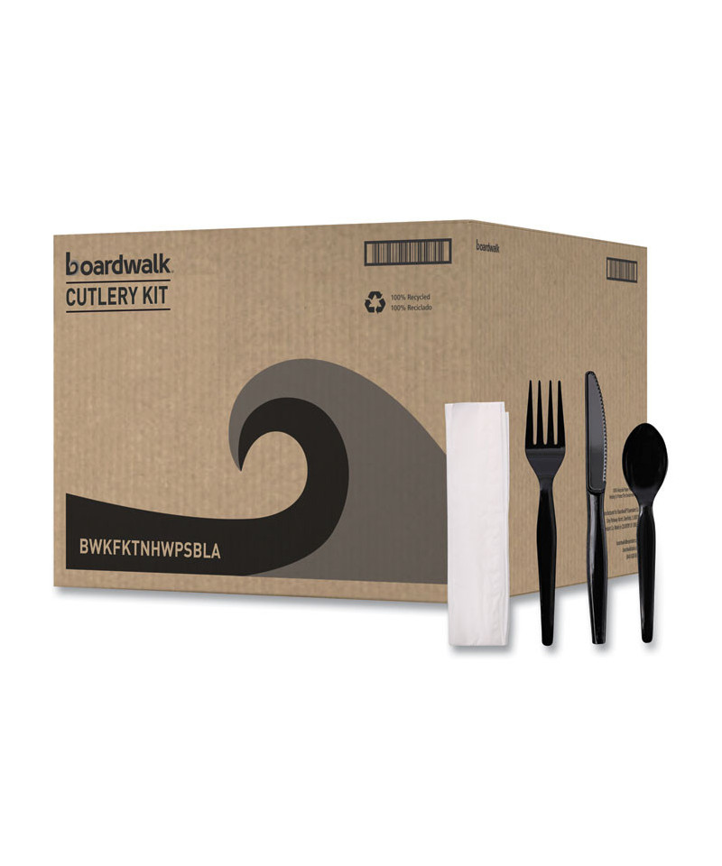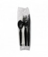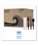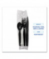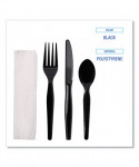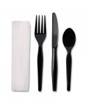 Four-Piece Cutlery Kit, Heavyweight, Fork/Knife/Napkin/Spoon, Plastic, Black, 250/Carton