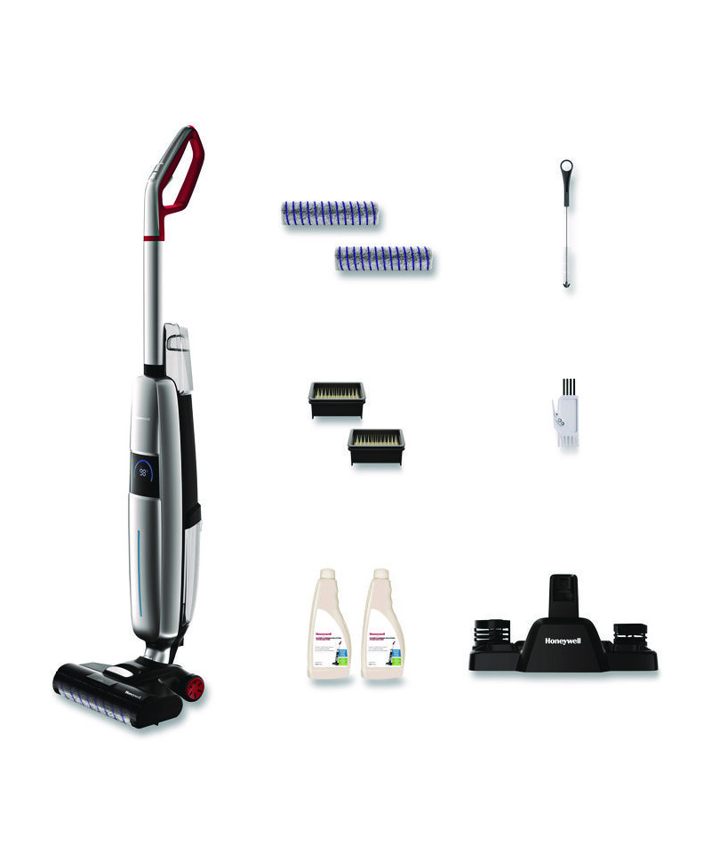The Honeywell FC15 ULTAMAX ELITE professional 3-in-1 Cordless Floor Cleaner is engineered to vacuum and wash hard floors simultaneously, and perfect for quick carpet clean-ups (without water). This high-performance device is equipped with a high-tech synchronized digital wet and dry motor for powerful suction and features a motorized multi-surface power scrub soft roller for an in-depth clean. Our innovative patent-pending design separates wet and dry waste, complemented by the precision spray nozzle and large, separate clean and dirty water tanks that ensure high-efficiency cleaning. The easy-to-use LED display and intelligent voice prompts, along with the advanced Smart Auto Clean Mode, optimize your cleaning experience. With an easy-change, high-capacity battery pack providing up to 30 minutes of runtime, and an easy-charge base with accessory storage, maintaining your device is effortless. The package includes two power scrub rollers, two wet/dry filters, and two bottles of multi-surface floor cleaner for the ultimate cleaning solution.