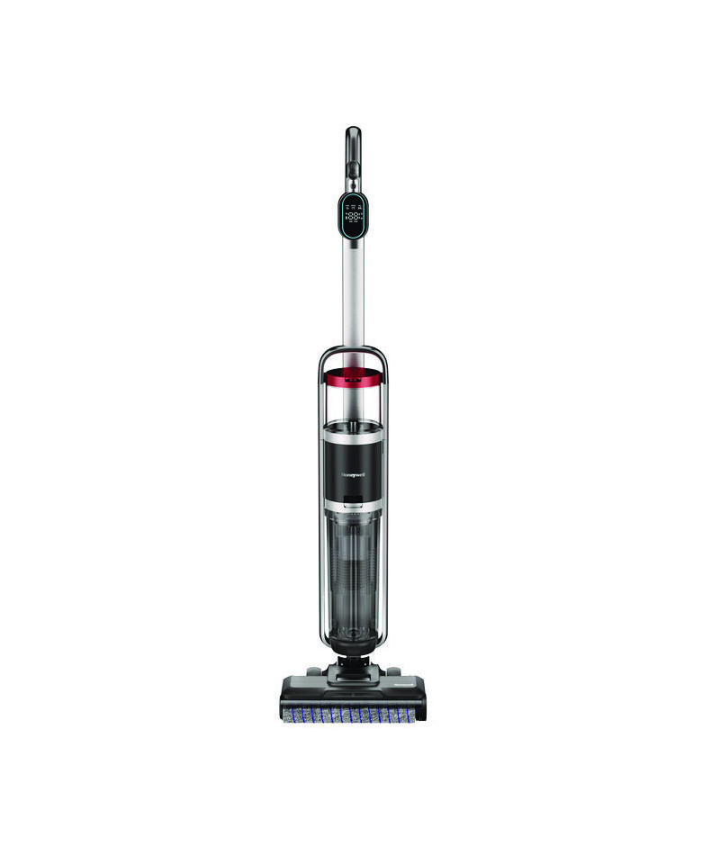 The Honeywell professional 3-in-1 Cordless Floor Cleaner is engineered to vacuum and wash hard floors simultaneously, and perfect for quick carpet clean-ups (without water). This high-performance device is equipped with a high-tech synchronized digital wet and dry motor for powerful suction and features a motorized multi-surface power scrub soft roller for an in-depth clean. Our innovative patent-pending design separates wet and dry waste, complemented by the stainless-steel precision spray nozzle and large, separate clean and dirty water tanks that ensure high-efficiency cleaning. Commercial-grade metal side support tubes add an extra layer of durability. The easy-to-use LED display and intelligent voice prompts, along with the advanced Smart Auto Clean Mode, optimize your cleaning experience. With an easy-change, high-capacity battery pack providing up to 35 minutes of runtime, and an easy-charge base with accessory storage, maintaining your device is virtually effortless. The package includes two power scrub rollers, two wet/dry filters, and two bottles of multi-surface floor cleaner for the ultimate cleaning solution.