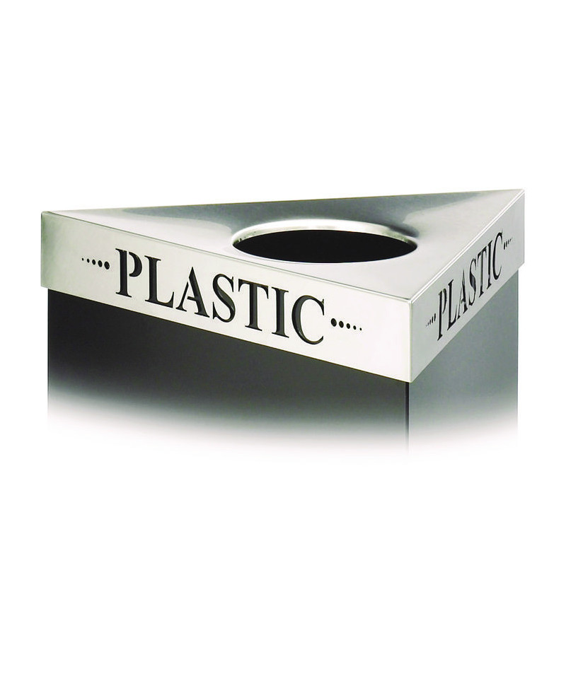 Sleek, stainless steel triangular lid has laser-cut inscription (unless otherwise specified) to identify recyclables. Part of Trifecta™ flexible design with four receptacles (sold separately), they offer a multitude of configurations to accommodate any workplace.
