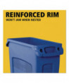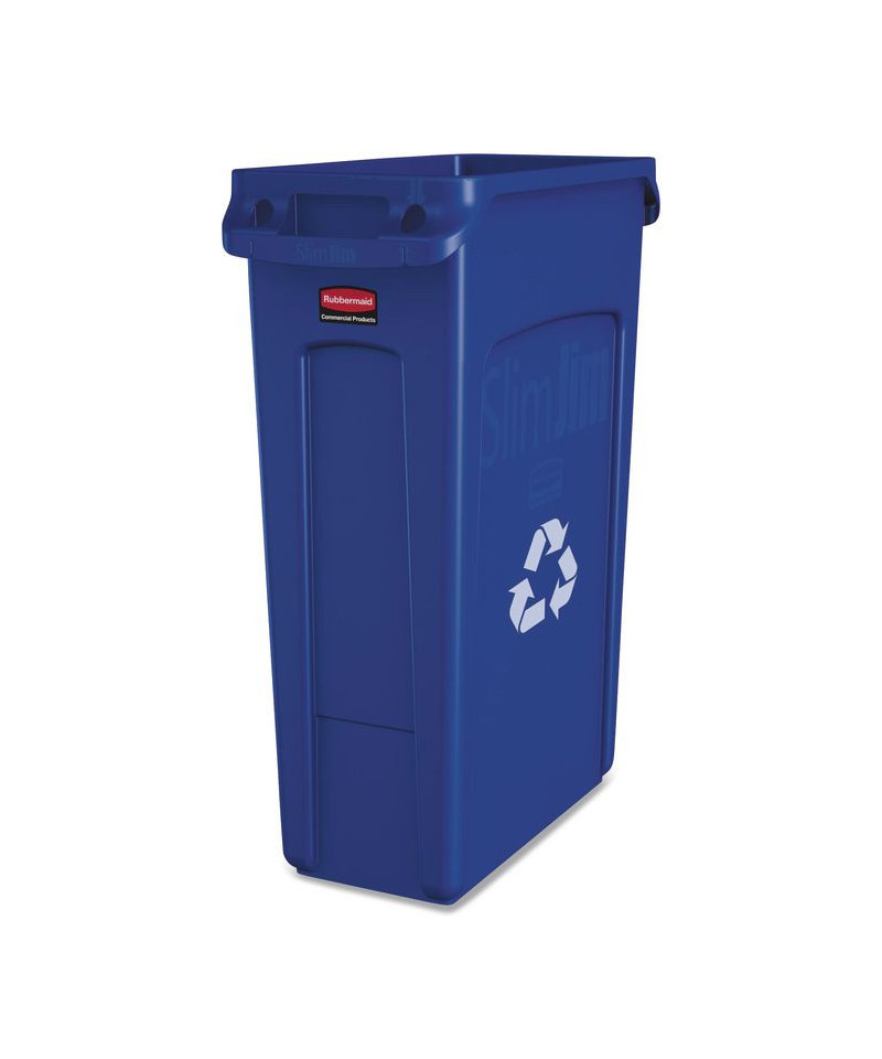 The Rubbermaid Commercial Products Vented Slim Jim Recycling Can Waste Receptacle, 23 Gallon, is crafted to make waste management compliance easier and reduce strain on workers. Constructed of high quality, commercial-grade materials, these trash cans feature four venting channels that make removing garbage bags up to 80% easier than traditional straight wall receptacles. By allowing air to flow into the can, liners can be pulled more easily from the recycling bin which reduces strain on staff and increases efficiency. Four bag cinches around the rib-strengthened reinforced rim create quick, knot-free liner changes. Sturdy handles and molded base grips make transporting and emptying contents more ergonomic while the step design prevents jamming when containers are nested. The Vented Slim Jim waste receptacle recycler is designed for superior durability and maximum efficiency.