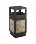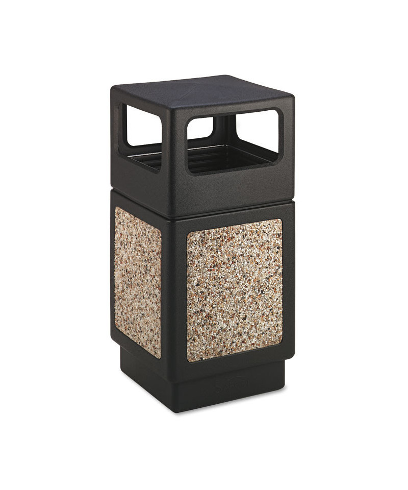 Canmeleon Outdoor/Indoor Aggregate Panel Trash Can features natural stone panels to help enhance outdoor areas while keeping them clean and litter free. Molded from high-density polyethylene with UV inhibitors, this attractive waste container performs in both indoor and outdoor conditions. Ribbed telescoping base opening securely holds liner bag in place and tucks under lid to avoid overhanging or unsightly bags. Recessed bottom offers easy maintenance. Constructed with natural stone, attractive aggregate panels feature a clear coating to make them feel smoother and keep them adhered to the panels. For weather resistance or to prevent vandalism, bottom of receptacle can be fastened to the pavement or weighted with sand or paving bricks. ideal for use on outdoor patios, meeting spaces, cafés, hotels, recreational and picnic areas, corporate and college campuses, boardwalks, malls, tourist attractions and other high traffic outdoor locations.