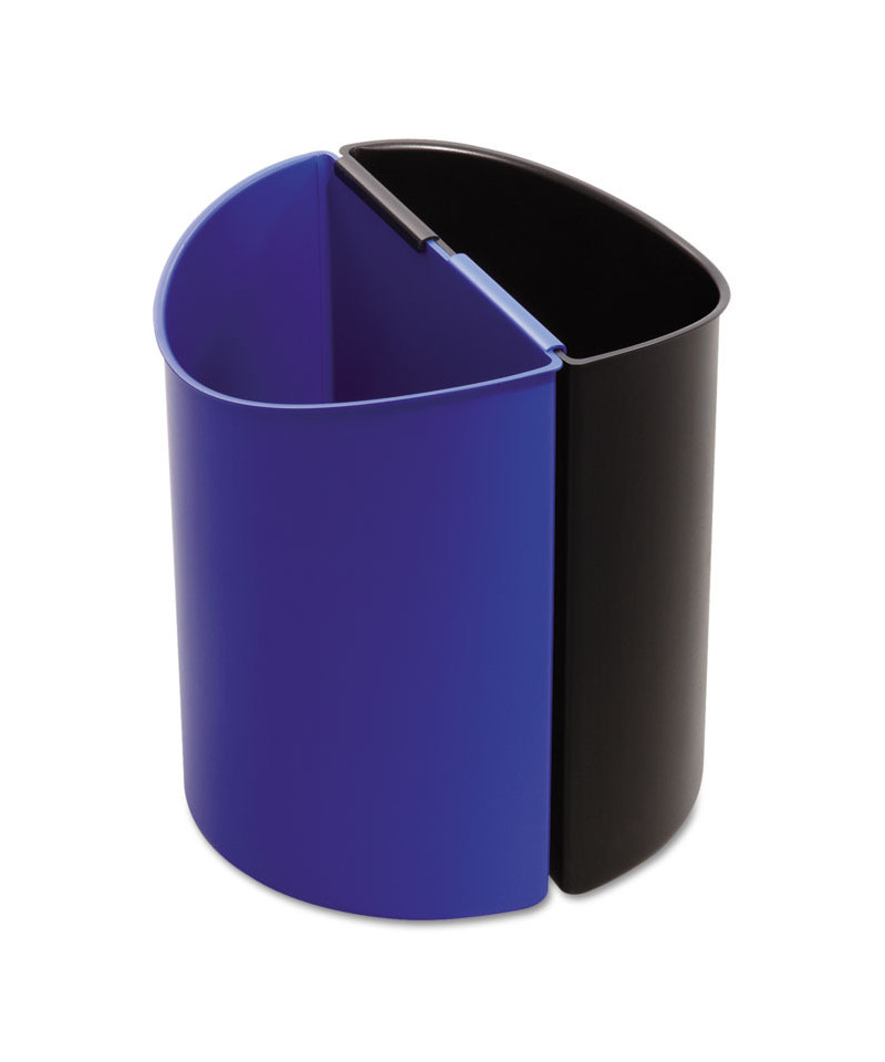 Solves all desk-side recycling needs. Latch two of these receptacles together for waste and recyclables, for two different types of recyclables, or use them individually. Combo-set includes one black and one blue receptacle.