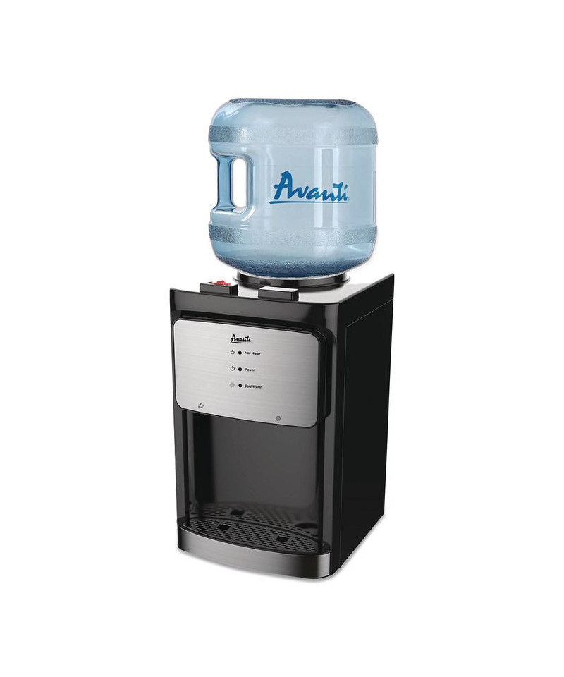 Save time and money with a dual tap, countertop thermoelectric water cooler from Avanti. With a sleek stainless steel finish, this is the perfect compact water cooler for the office, kitchen, worksite, warehouse, gym, or anywhere you want to add access to water. Enjoy instant access to a refreshing glass of cold drinking water or easily prepare your favorite hot beverage, soup, or oatmeal from the dual faucet dispenser. This top-loading water dispenser accommodates three or five gallon water bottles, helping reduce waste from single-serve bottles.